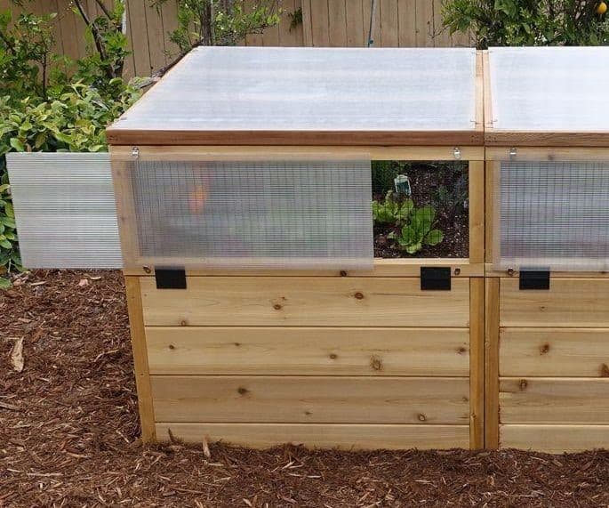 这款3×6英尺的盒子采用耐腐烂的红色雪松,采用铰链顶部,含有清澈的聚碳酸酯板。打开顶部以进入内部凸起的种植床,距离地面24英寸舒适。两个前面板向下折叠或滑动,以便调节气流和温度。